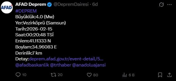 Afet ve Acil Durum Yönetimi Başkanlığı (AFAD), Samsun'un Vezirköprü ilçesinde bir deprem meydana geldiğini duyurdu.