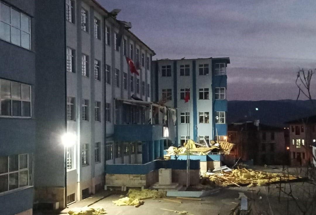 Kuvvetli rüzgarın etkisiyle okulun çatısı uçtu. Çatıdan kopan sac ve demir parçaları çevreye savrulurken, ihbar üzerine bölgeye polis ve itfaiye ekipleri sevk edildi. Polis ekipleri çevrede güvenlik önlemleri alırken, itfaiye görevlileri de yola düşen parçaları temizledi.