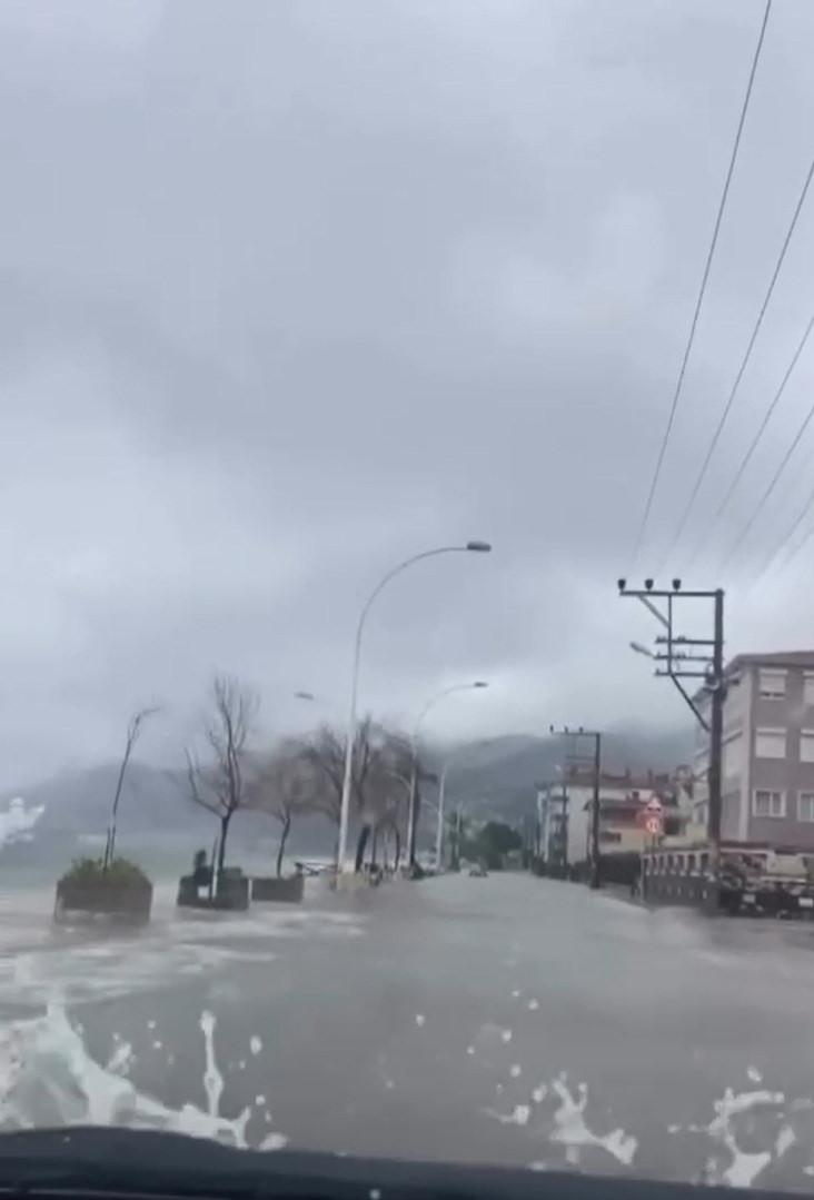 Bursa’nın Gemlik ilçesinde etkili olan fırtına ve yağış, yaşamı olumsuz etkiledi. Rüzgar ve yağışın etkisiyle yüksek dalgalar deniz ile karayı birleştirdi.