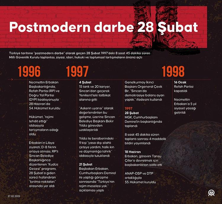 28 Şubat postmodern darbesinin üzerinden 29 yıl geçti. Türkiye Büyük Millet Meclisi Başkanı Numan Kurtulmuş, İletişim Başkanı Burhanettin Duran, Adalet Bakanı Akın Gürlek, Büyük Birlik Partisi Genel Başkanı Mustafa Destici, siyasi parti temsilcileri ve bazı dernek ve vakıflar, 28 Şubat karanlığını unutmadı.