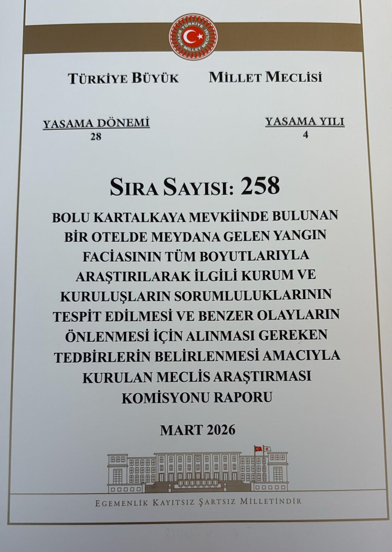 “Bolu Kartalkaya Mevkiinde Bulunan Bir Otelde Meydana Gelen Yangın Faciasının Tüm Boyutlarıyla Araştırılarak İlgili Kurum ve Kuruluşların Sorumluluklarının Tespit Edilmesi ve Benzer Olayların Önlenmesi İçin Alınması Gereken Tedbirlerin Belirlenmesi” başlığını taşıyan raporda, kurumların görev ve sorumluluklarını belirleyen mevzuat ayrıntılı biçimde ele alındı.