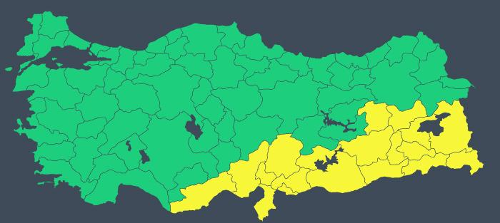 Adana, Adıyaman, Bingöl, Bitlis, Diyarbakır, Gaziantep, Hakkari, Hatay, Mersin, Kahramanmaraş, Mardin, Muş, Siirt, Şanlıurfa, Van, Batman, Şırnak, Kilis ve Osmaniye için sarı kodlu uyarı yapıldı.