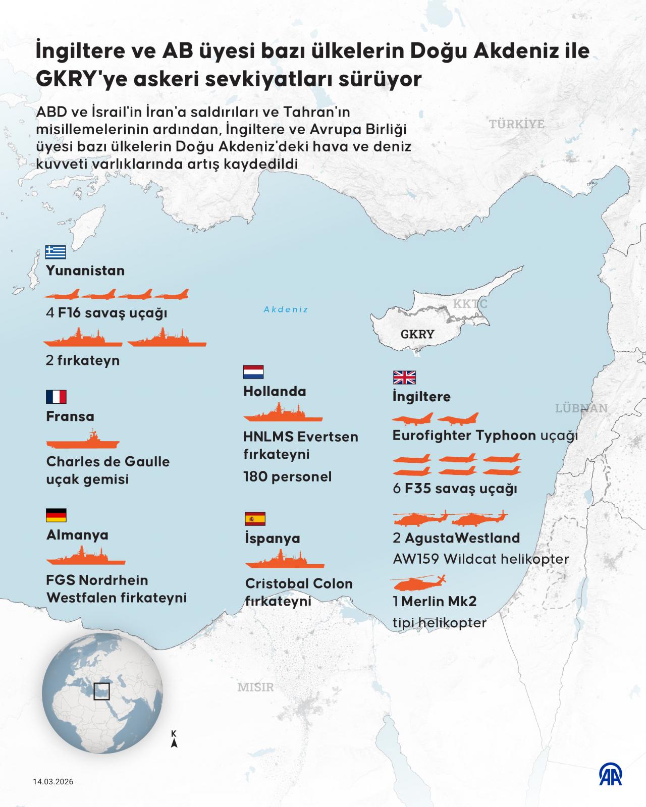 Yunanistan ve destekçisi Avrupa ülkeleri İsrail ve ABD'nin İran'a karşı saldırılarını fırsat bilerek Güney Kıbrıs Rum Yönetimi etrafına çok sayıda teçhizat konuşlandırdı. İran'dan gelecek füzelere karşı Rum Yönetimini korumak amacıyla bölgeye gönderilen firkateynlere Türkiye tepki göstermezken Türkiye'de KKTC'ye 6 adet F-16 konuşlandırmıştı.