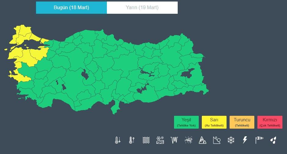 Meteoroloji Genel Müdürlüğü; Balıkesir, Bursa, Çanakkale, Edirne, İstanbul, İzmir, Kırklareli, Tekirdağ, Yalova için sarı kodlu uyarıda bulundu.