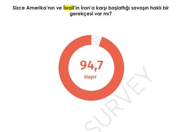 "İsrail ve ABD’nin İran’a karşı başlatmış olduğu savaşın haklı gerekçesi var mı?" Sorusuna ilişkin ise Türk toplumunun yüzde 94,7’si haklı bir gerekçe bulunmadığı fikrinde cevap verdi.
