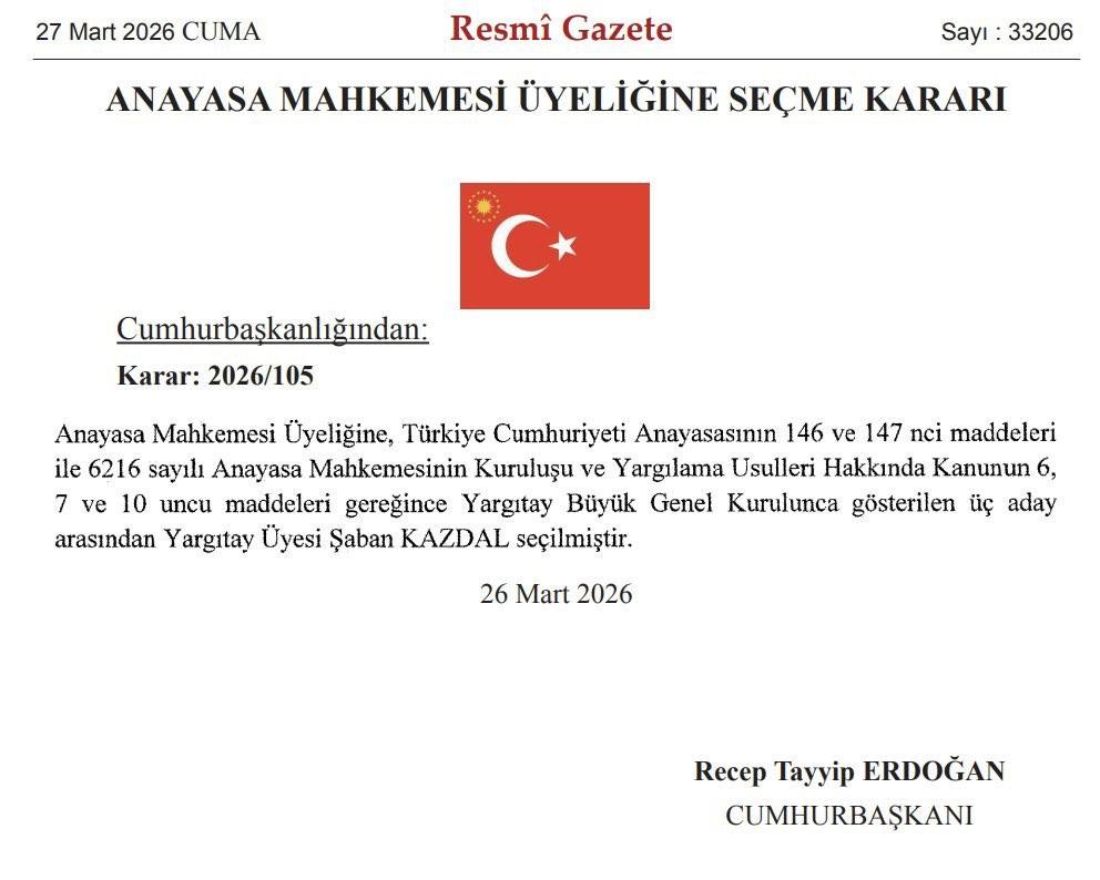 Cumhurbaşkanı Erdoğan, Anayasa Mahkemesi (AYM) üyeliğine Yargıtay Büyük Genel Kurulunca gösterilen üç aday arasından Şaban Kazdal'ı seçti. Karar, Erdoğan'ın imzasıyla Resmi Gazete'de yayımlandı.