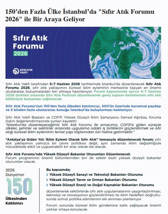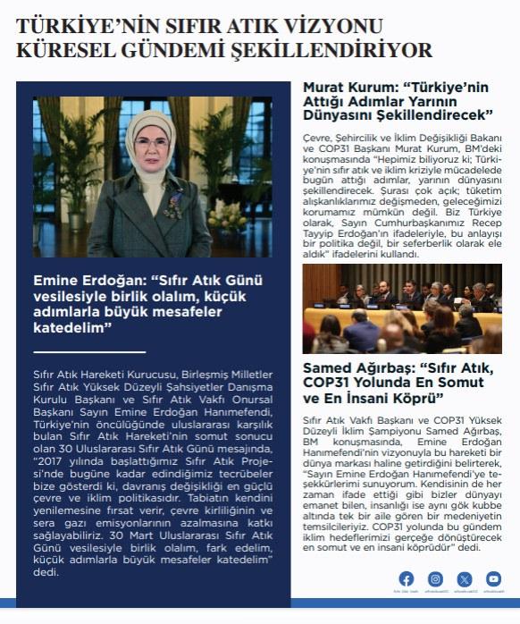 Sıfır Atık Vakfı, Mart 2026 dönemine ait faaliyetlerini içeren e-bültenini yayımladı. Bülten, çevresel farkındalığın artırılmasına yönelik saha uygulamaları, iklim diplomasisi alanındaki katkılar ve Sıfır Atık vizyonunu güçlendiren projeler hakkında güncel bilgileri içeriyor.