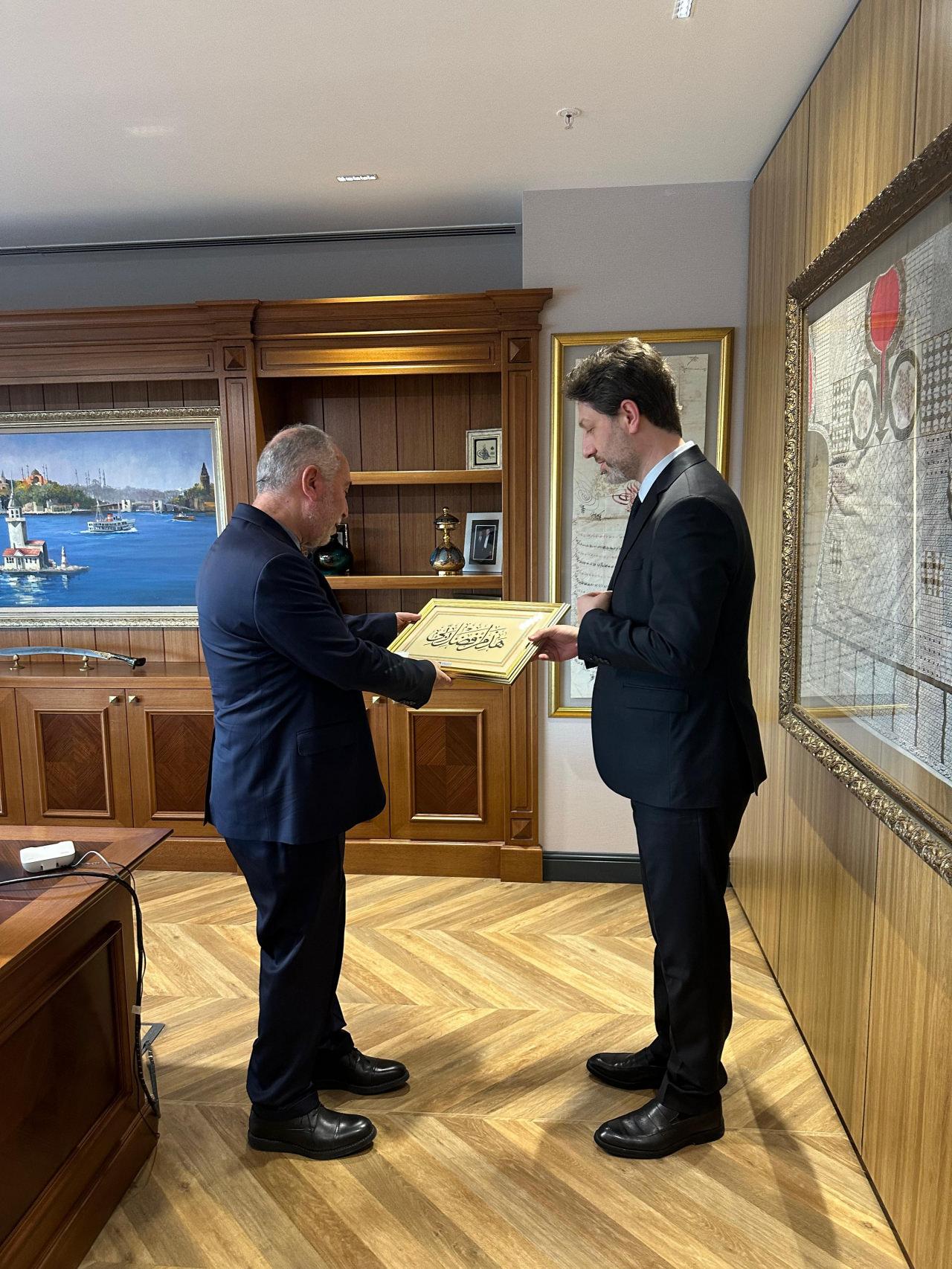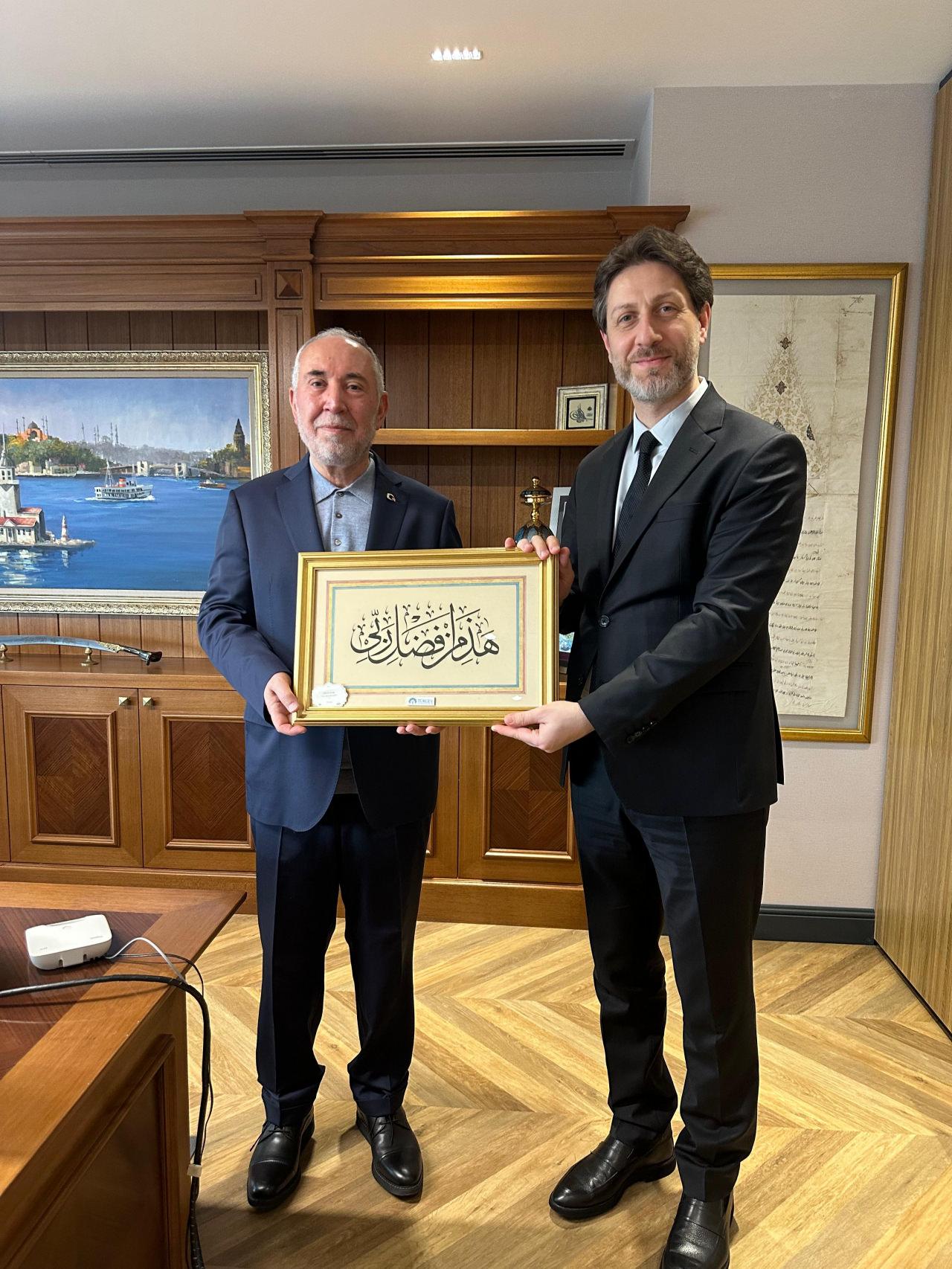 TÜRGEV Genel Müdürü Dr. Selim Gençal, Kanal 7'yi ziyaret etti. Kanal 7 Medya Grubu Başkanı Zekeriya Karaman’ın ev sahipliğinde gerçekleşen ziyaret, anlamlı bir hat sanatı hediyesiyle tamamlandı.
