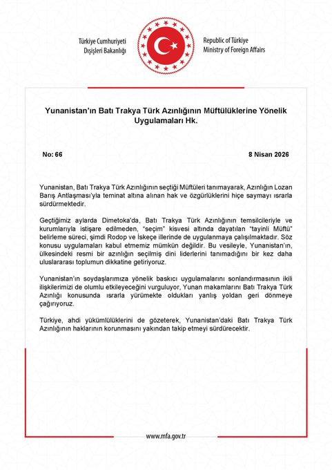 Bakanlık tarafından yapılan açıklamada, “Yunanistan, Batı Trakya Türk Azınlığının seçtiği Müftüleri tanımayarak, Azınlığın Lozan Barış Antlaşması’yla teminat altına alınan hak ve özgürlüklerini hiçe saymayı ısrarla sürdürmektedir.