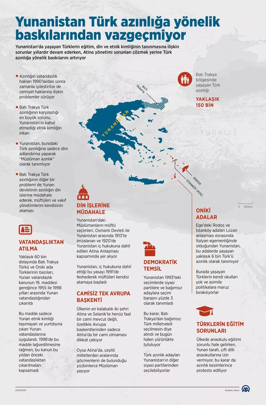 Lozan Antlaşması’nda Yunanistan’daki Müslüman azınlıklarına geniş nüfus imkânları tanınırken, Batı Trakya’da Türklere yönelik yapılan baskı sonucunda nüfus oranı giderek düşüyor. 1955-1998 yıllarında yaklaşık 60 bin Batı Trakya Türk’ü vatandaşlıktan çıkarıldı.