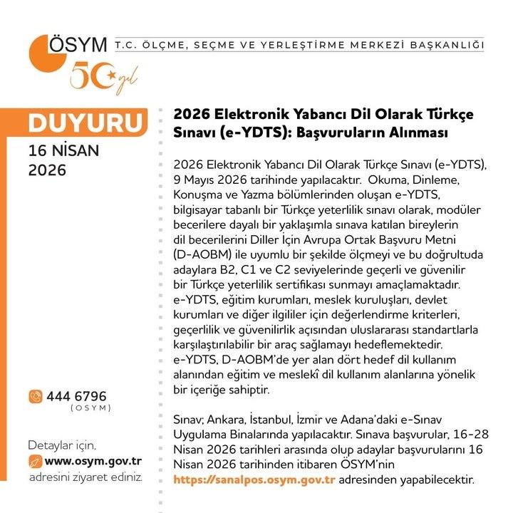 ÖSYM, 2026 Elektronik Yabancı Dil Olarak Türkçe Sınavı (e-YDTS) başvurularının başladığını duyurdu. Türkçe yeterliliğini ölçen sınav, 9 Mayıs 2026 tarihinde gerçekleştirilecek.