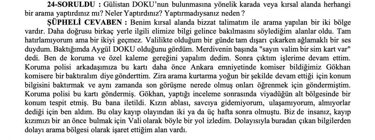 Bununla birlikte sorgudaki başka sorular da bu konudaki şüpheleri güçlendirdi. Barajda Gülistan’a ait olduğu belirtilen bazı eşyalar bulunmasına rağmen bedenin bulunamaması, uzman ekiplerin “barajda değildir” yönündeki değerlendirmeleri ve buna rağmen aramaların uzatılması, savcılık tarafından doğrudan sorgulandı.