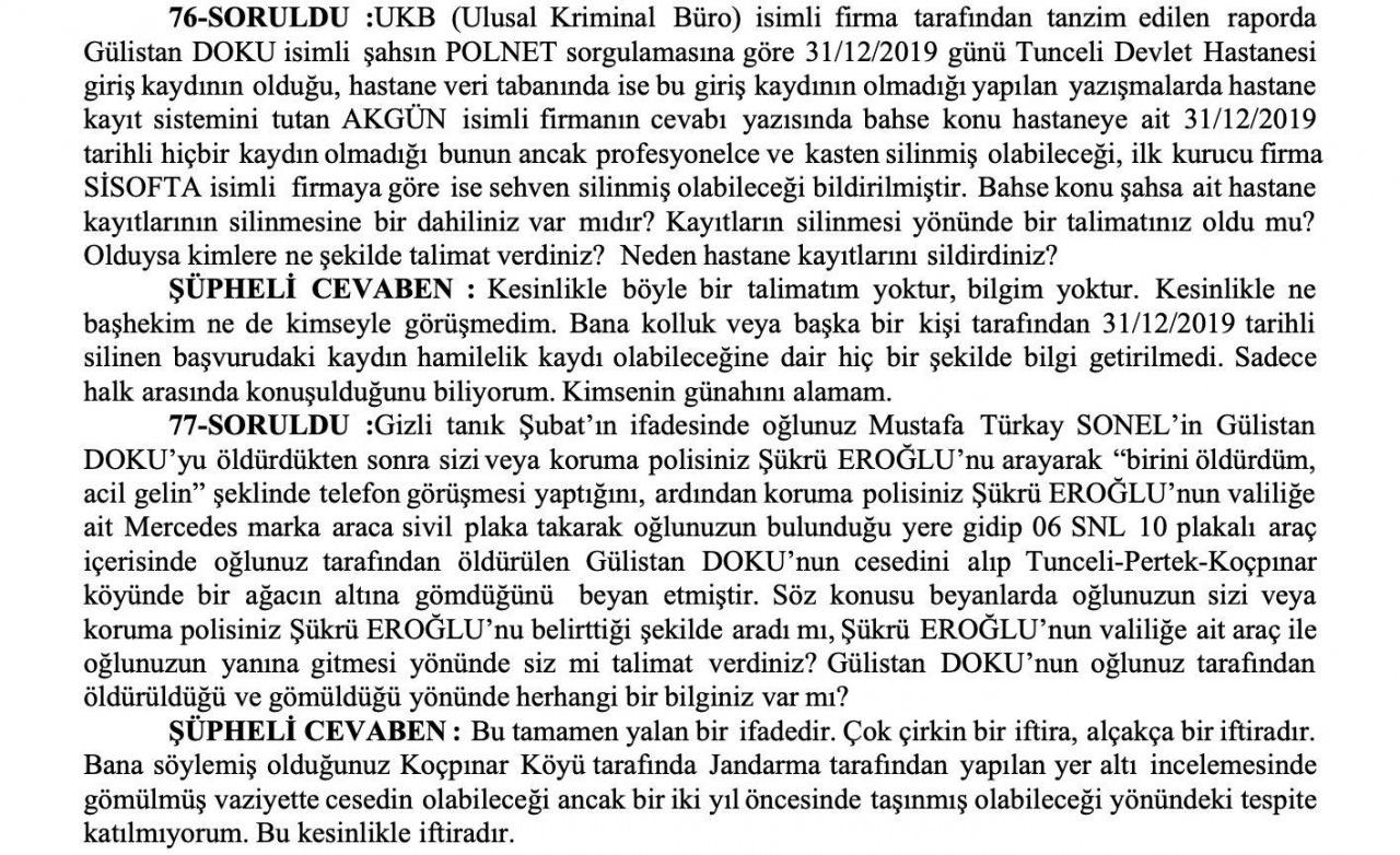 Erzurum Cumhuriyet Başsavcılığı’nda alınan 78 soruluk sorguda, dönemin Tunceli Valisi Tuncay Sonel’e Gülistan Doku dosyasının en kritik başlıkları tek tek yöneltildi. İfade tutanağına yansıyan sorular; usulsüz şekilde incelemeye gönderilen sim karttan, silindiği öne sürülen kamera ve hastane kayıtlarına, oğlu Mustafa Türkay Sonel hakkındaki ağır iddialardan, koruma polisi Şükrü Eroğlu’nun rolüne kadar dosyanın en karanlık noktalarını yeniden gündeme taşıdı. Sonel ise suçlamaların tamamını “iftira”, “kurgu” ve “itibar suikastı” olarak niteledi.