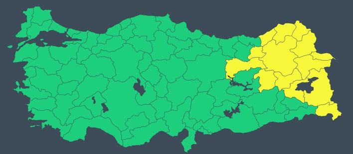 İşte sarı kod verilen iller: Ağrı, Artvin, Bingöl, Bitlis, Erzincan, Erzurum, Hakkari, Kars, Muş, Rize, Van, Bayburt, Ardahan, Iğdır