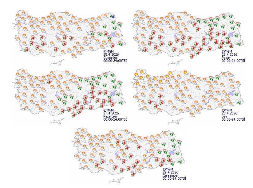 Yurt genelinde hava parçalı ve çok bulutlu seyrediyor. Akdeniz (Hatay hariç), İç Anadolu’nun güney ve doğusu, Doğu Karadeniz ve Doğu Anadolu’da aralıklı sağanak ve yer yer gök gürültülü yağış bekleniyor. Denizli, Afyonkarahisar, Ordu, Tokat, Siirt ve Adıyaman çevreleri de yağışlı havadan etkilenecek.