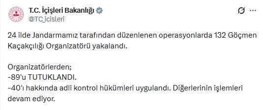 İçişleri Bakanlığı, 24 ilde düzenlenen göçmen kaçakçılığı operasyonlarında yakalanan 132 göçmen kaçakçılığı organizatöründen 89'unun tutuklandığını açıkladı.