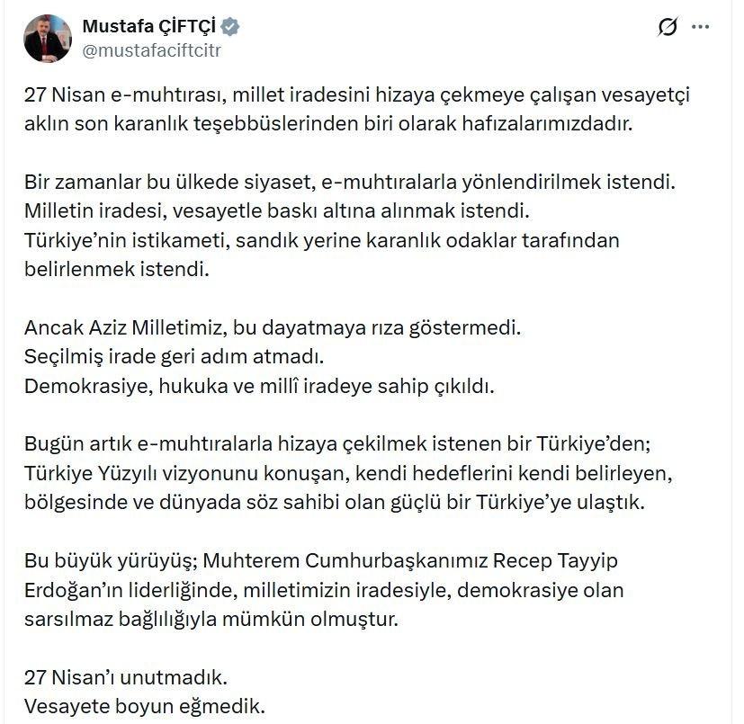 Bakan Çiftçi, "Bugün artık e-muhtıralarla hizaya çekilmek istenen bir Türkiye'den; Türkiye Yüzyılı vizyonunu konuşan, kendi hedeflerini kendi belirleyen, bölgesinde ve dünyada söz sahibi olan güçlü bir Türkiye'ye ulaştık. Bu büyük yürüyüş; Muhterem Cumhurbaşkanımız Recep Tayyip Erdoğan'ın liderliğinde, milletimizin iradesiyle, demokrasiye olan sarsılmaz bağlılığıyla mümkün olmuştur. 27 Nisan'ı unutmadık. Vesayete boyun eğmedik. Milli iradeden taviz vermedik. Türkiye Yüzyılı'nı kararlılıkla inşa ediyoruz" ifadelerini kullandı.
