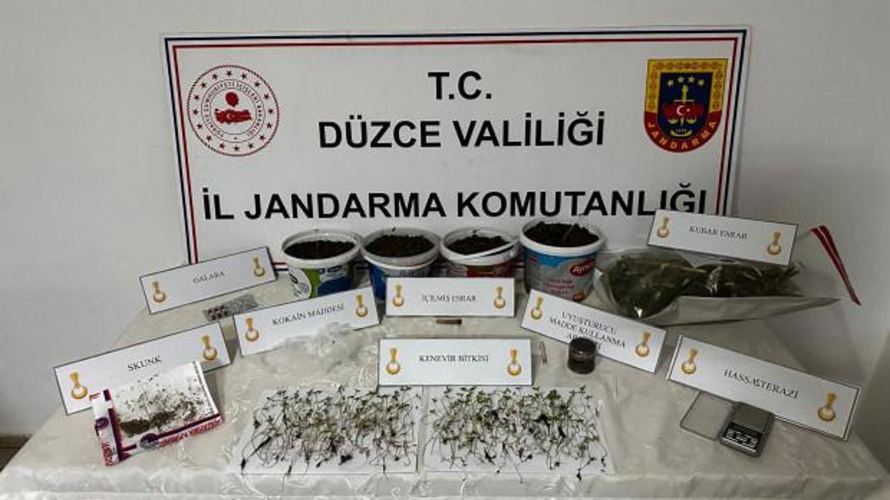 Düzce’de jandarmanın bir eve düzenlediği baskında saksılar içerisinde 225 kök kenevir bitkisi ile satışa hazır esrar, kokain ve skunk ele geçirildi. Zehir imal edip satan şüpheli yakalandı.