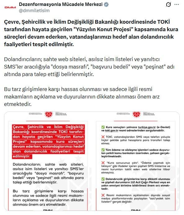 "Çevre, Şehircilik ve İklim Değişikliği Bakanlığı koordinesinde TOKİ tarafından hayata geçirilen 'Yüzyılın Konut Projesi' kapsamında kura süreçleri devam ederken, vatandaşlarımızı hedef alan dolandırıcılık faaliyetleri tespit edilmiştir.