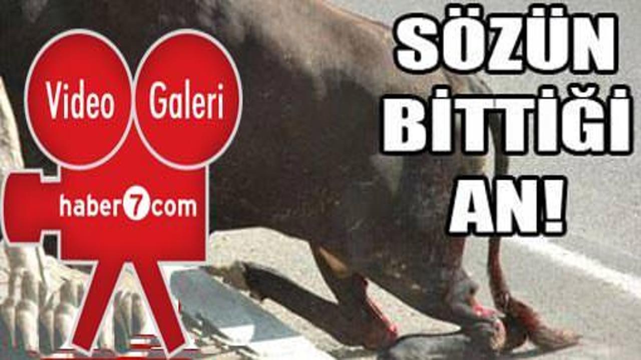 Sahipleriyle birlikte boğanın yanına gelen kasap sinirli bir şekilde elindeki bıçağı arka iki ayaklarına bıçak salladı. Her iki ayağı kesilen hayvan, can çekişerek koşmaya çalıştı. Boynundaki ipten kurtulamayan boğa, dakikalarca can çekişti.