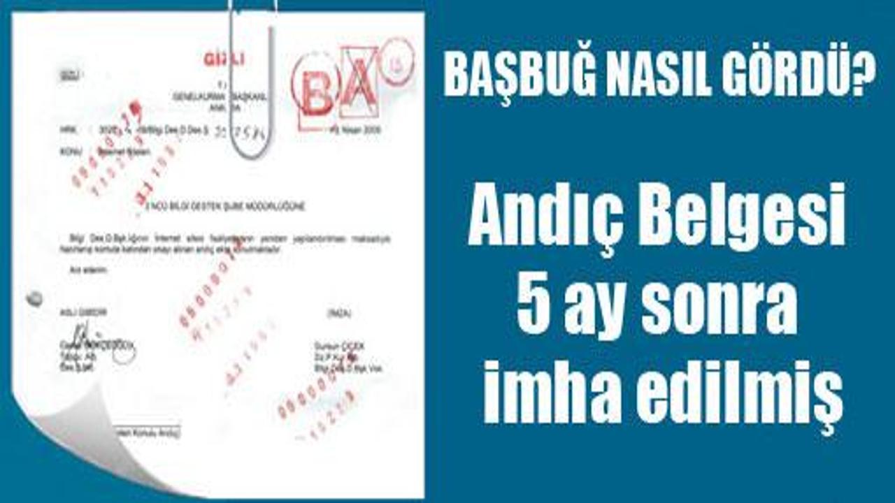 Başbuğ'un, 'gördüm' dediği tarihten iki ay önce imha edildiği bildirilen belgenin nasıl görüldüğü soru işaretlerine yol açtı. Mahkemenin talebi üzerine Genelkurmay'dan gönderilen yazıda andıç belgesinin aslının imha edildiği aktarılıyor. İmha işlemini yapanlar arasında andıç sanıklarından Yüzbaşı Murat Uslukılıç da bulunuyor. İmha tarihi ise hazırlandıktan 5 ay sonrasını yani 3 Eylül 2009'u gösteriyor. Yazıda belgenin arşiv kategorisi 'B' olarak işaretlenmiş. Emekli Binbaşı Kemal Şahin, TSK Arşiv Yönergesi'ne göre 'B' kategorisindeki belgelerin saklanma süresinin 5 yıl olduğuna dikkat çekiyor. "Bir belge imal edildikten 5 ay sonra imha ediliyorsa açık bir delil karartma durumu söz konusu olur. Zamanı gelmeden yapılan imha suçtur ve sorumlular hakkında soruşturma açılmalıdır." diyor.