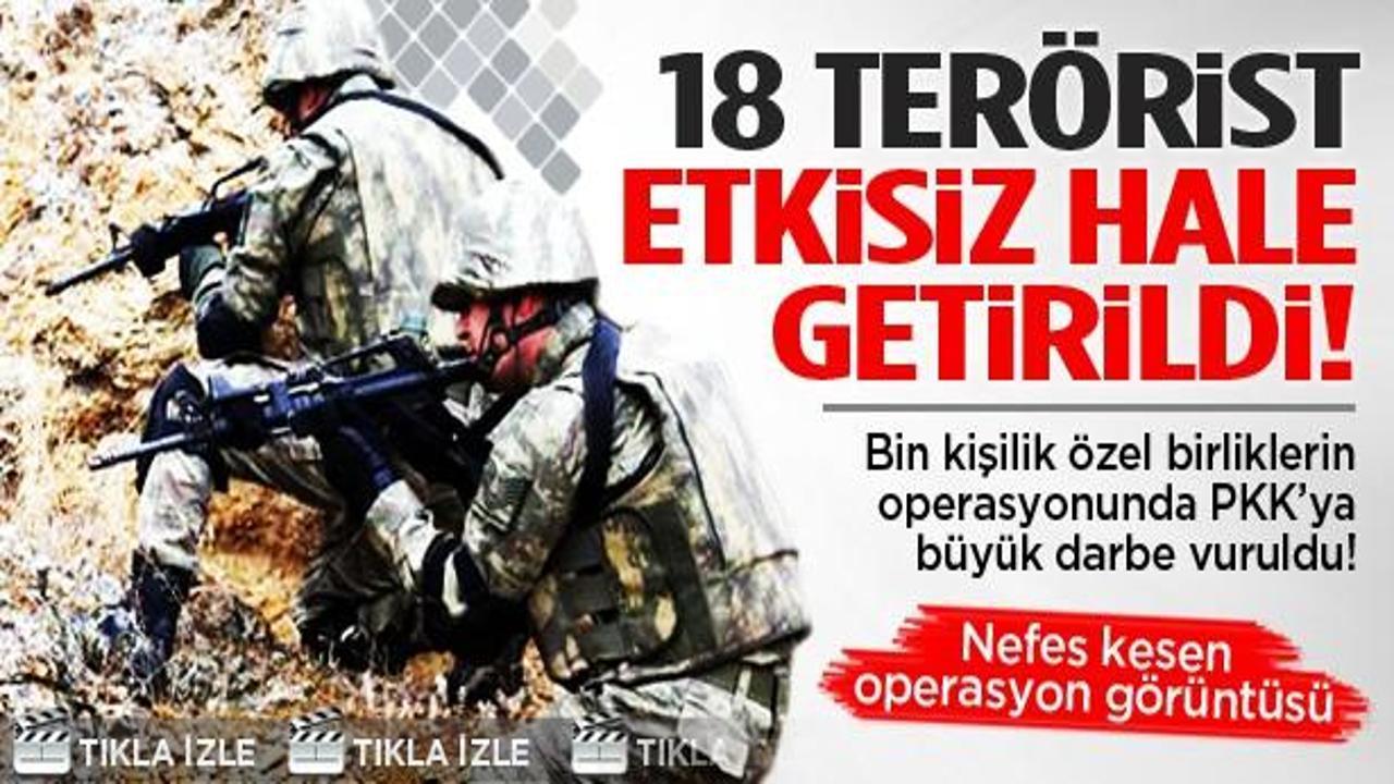 Bölge genelinde son dönemde icra edilen operasyonlarda 13'ü ölü, 5'i sağ olmak üzere toplam 18 PKK'lı terörist etkisiz hale getirildi. Operasyonlarda, 8 adet kaleşnikof, 8 adet M-16 piyade tüfeği, 1 adet RPG-7, 3 adet RPG-7 mühimmatı, 21 adet el bombası, 72 adet fünye, 100 gram A-4 patlayıcı madde, 12 adet patlayıcı düzeneği, 4'ü terör örgütü mensuplarının Kuzey Irak'taki ana karargahları ile görüşmelerde kullandıkları büyük telsiz olmak üzere toplam 10 adet telsiz, 3 adet dürbün, çok miktarda patlayıcı madde yapımında kullanılan malzeme ile bol miktarda yiyecek ve yaşamsal malzeme ele geçirildi.