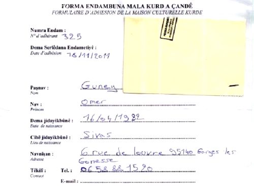 "2011 yılı Kasım ayında önce Paris kent merkezinde bulunan derneğe geliyor. Dernek Başkanına 'Üye olmak istiyorum' diyor. Dernek Başkanı Paris'in hangi bölgesinde ikamet ettiğini soruyor. 'Sarcel'de oturuyorum' yanıtını alınca oraya en yakın olan Villiers-le-Bel Derneği'ne yönlendiriyor. Dernek yönetiminden birinin yanına gidiyor. 18 Kasım 2011 tarihinde Villiers-le-Bel'deki derneğimize üye oluyor. 50 Euro da aidat veriyor. Sonrasında herhangi bir üye gibi gidip gelmeye başlıyor. Samimi oluyor, dernek çevresindeki etkinlik ve aktivitelere katılıyor. Fransızcası iyiymiş, birçok insanımızın dil sorunu olduğu için işlemlerinde tercümanlık yapıyor. Giderek toplumumuz içinde dikkat çekmeyecek bir yer ediniyor. Ancak, tüm araştırmalarımız bu kişinin hiçbir Kürt derneğinde resmi bir görev üstlenmediği yönündedir. Sadece bir üyedir. Derneklerimizde üyelik sistemimiz biliniyor. Renk, ırk, kökene bakmıyoruz. Bizim derneklerimize Türkler de Fransızlar da üye olabiliyor. Bizim bakış açımız insanlığa farklıdır. Her Kürdistanlı, her insan istediği takdirde derneklerimize üye olabilir. Demokratik kitle örgütleridir. Herhangi bir şartımız yok."