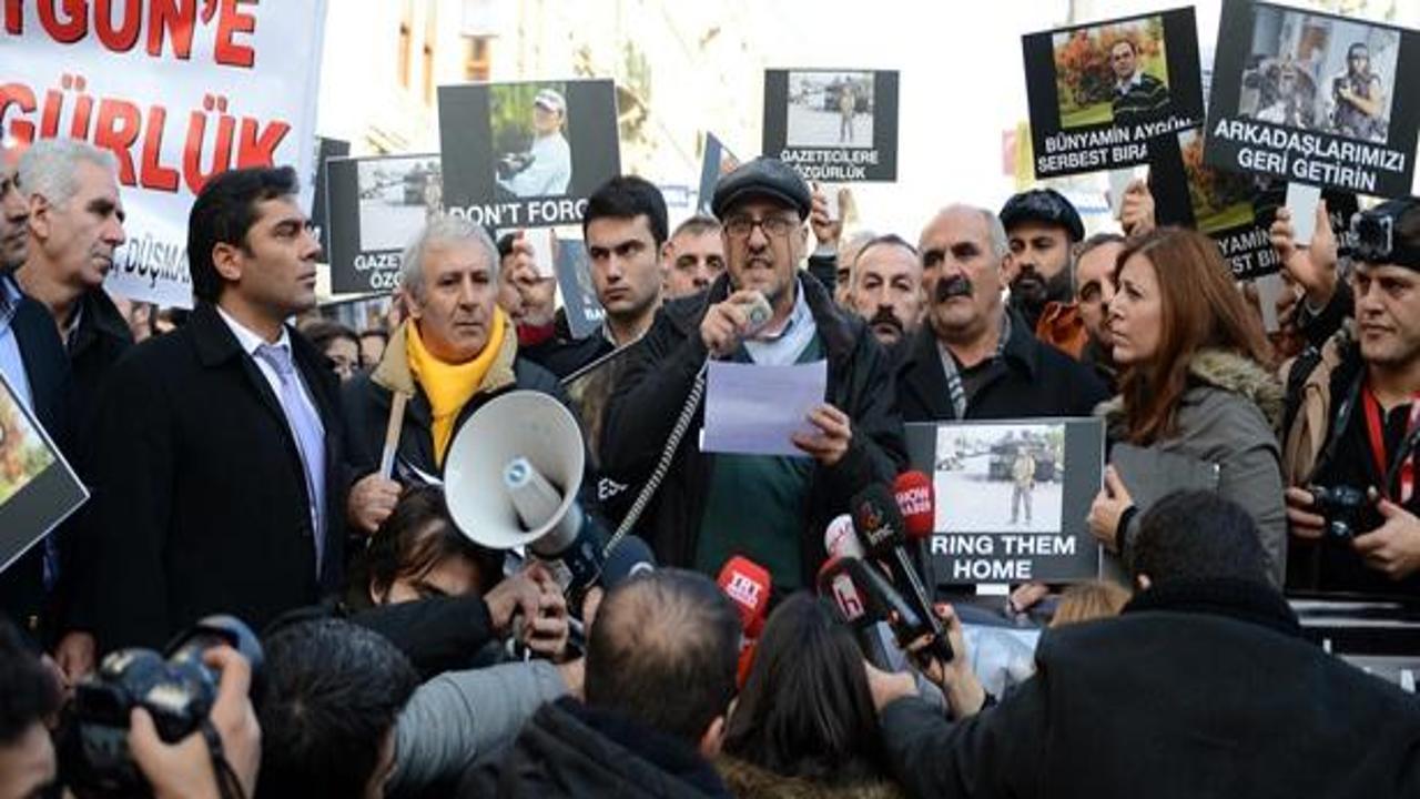 Gruptakiler; "Arkadaşımızı geri istiyoruz", "Bünyamin'i unutma", "Gazetecilere özgürlük" ve "Bünyamin Aygün onurumuzdur" dövizleri açarak slogan attı.