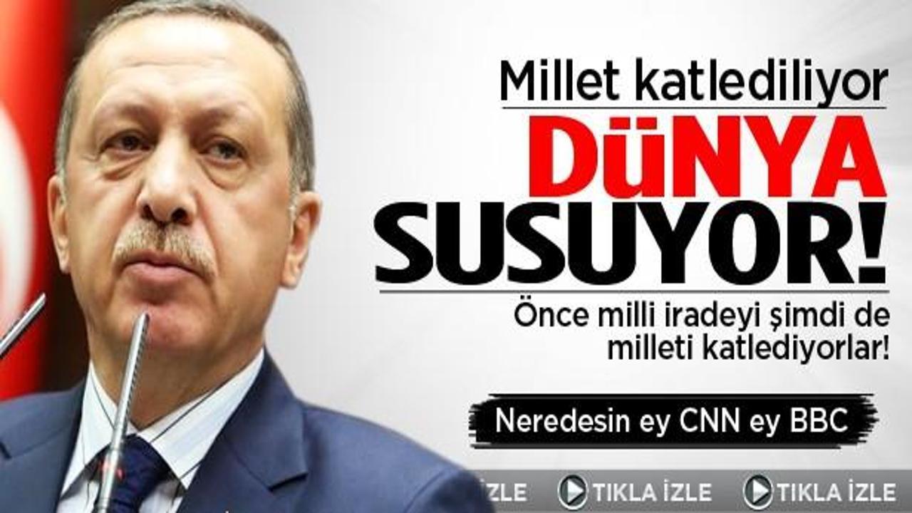 Mısır'da milli irade katledilirken susanlar, şu anda millet katledilirken aynı şekilde susuyorlar. Hani nerede Avrupa, nerede AB, nerede, Avrupa değerleri, sağa sola demokrasi dersi verenler? Hani nerede demokrasi, nerede demokratik değerler? Birleşmiş Milletler nerede? Türkiye'de polisin son derece haklı, son derece meşru şekilde kullandığı su ve biber gazı için yaygara koparanlar, Mısır'daki darbe karşısında Mısır'daki katliam karşısında neredeler?"