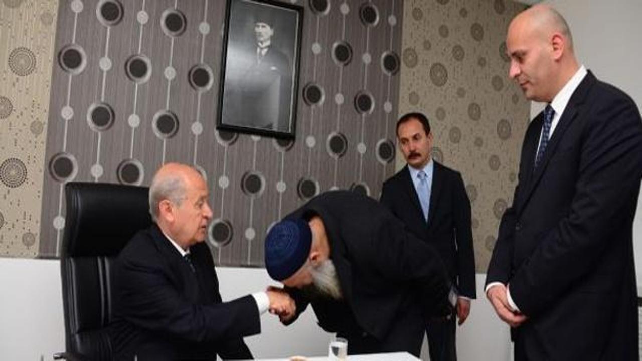 MHP Lideri Devlet Bahçeli, Seyhan'da yaptığı miting öncesi gerçekleştirdiği ziyaretinde yaşlı bir amcaya elini öptürdü.