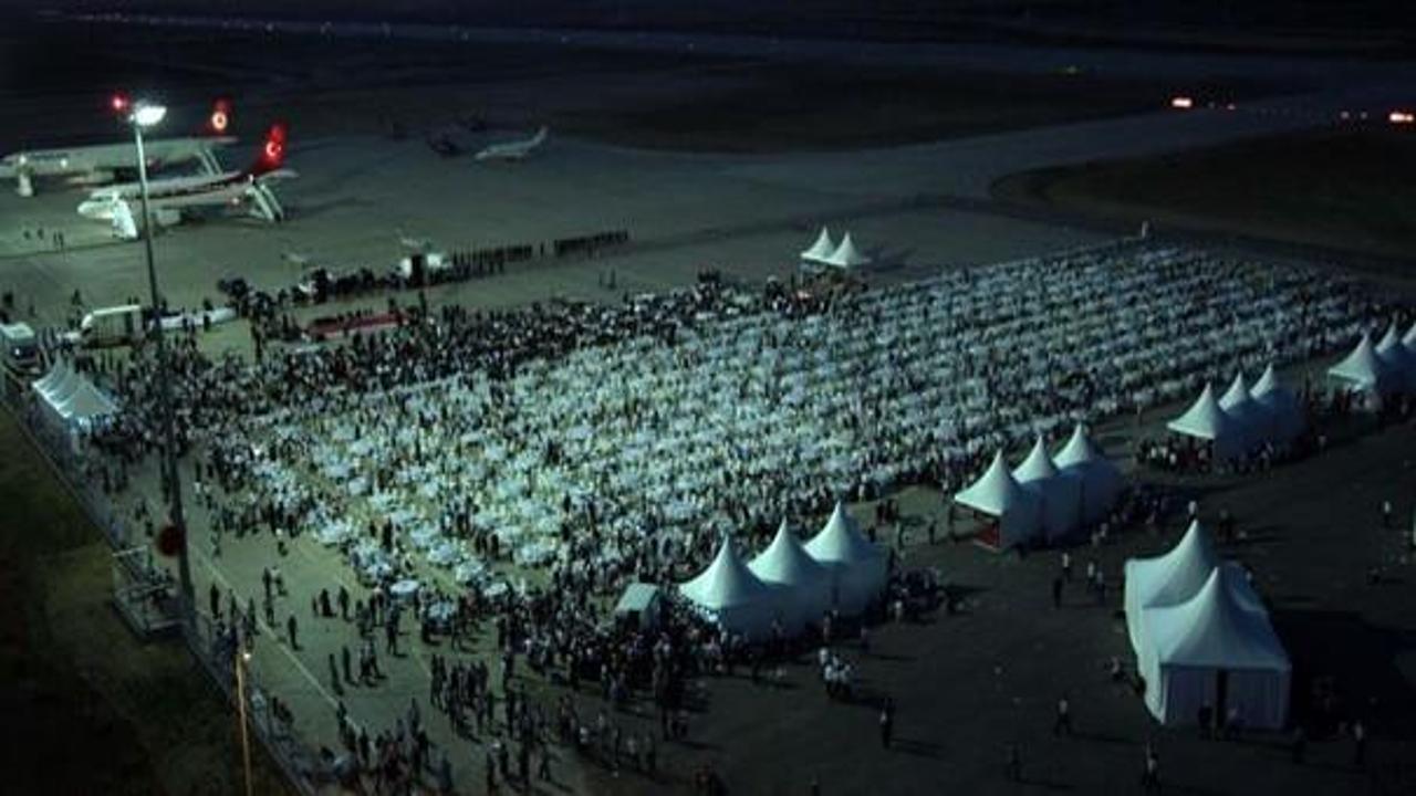 Açık havada uçakların gölgesinde gerçekleşen iftar yemeği renkli görüntülere sahne oldu... Havalimanı'na kurulan iftar sofralarında tüm misafirler yemek yedi. Türkiye'de ilk kez böyle bir iftar yapılmış oldu.