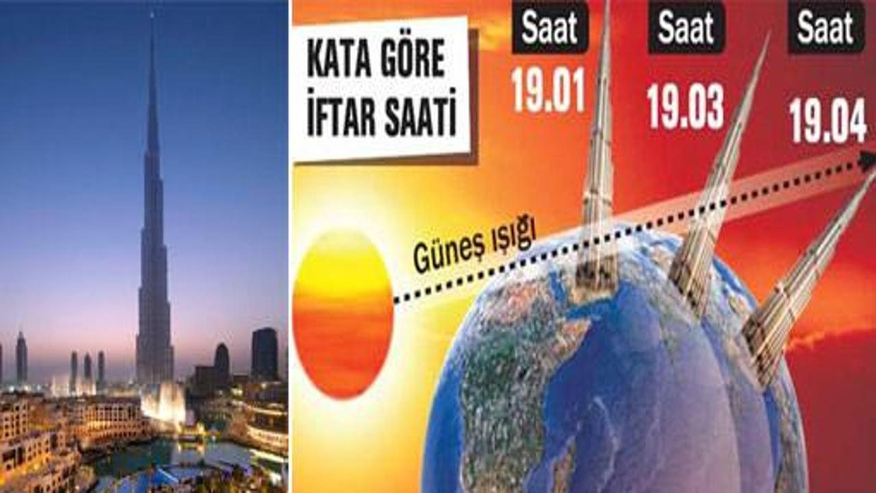 Dubai Müftüsü Muhammed el Kubaysi’nin iddiasına göre 80’inci kat ve üzerinde yaşayanların Dubai için belirlenen iftar saatinden iki dakika geç oruçlarını açmaları, 150’nci kattan yukarıda yaşayanların ise üç dakika daha geç iftar sofrasına oturmaları gerekiyor.
