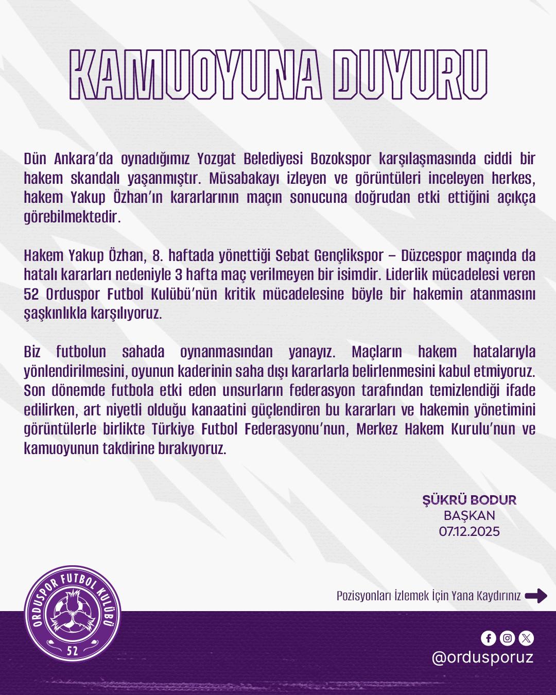 52 Orduspor Futbol Kulübü, Bozokspor maçının hakemi Yakup Özhan'ın kararlarına isyan etti ve TFF'ye çağrı yaptı.