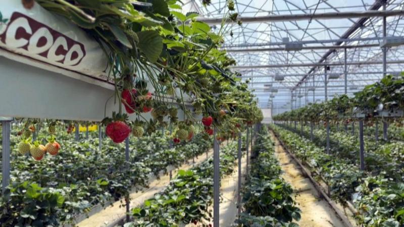 Sera sorumlusu Adem Emecan, “7 dönüm 250 metre kuruluş alanı var, 10 dönüm civarında tamamı. Senede 100 ton civarında çilek üretiyoruz. Dubai, Bahreyn, Kırgızistan o taraflara gönderiyoruz. Diğerlerini sayamadım, 6 ülke var. iç piyasaya da aynı zamanda veriyoruz. 9 kişi kadrolu eleman var, gündelikçiler geliyor bazen 5 oluyor 15 oluyor. Tekrar toplayanlar var, o zaman 25-30 kişi oluyor” şeklinde konuştu.