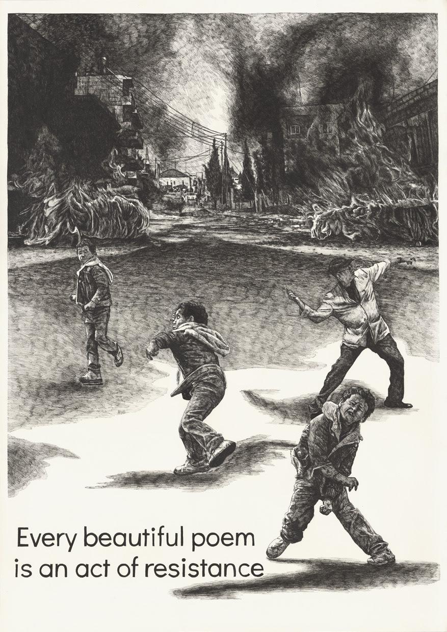 Pek çok eser, Filistin’in “ulusal şairi” olarak anılan Mahmud Derviş’in dizelerinin izlerini taşır. Sergi boyunca bu dizeler, dalların arasından geçen bir rüzgar gibi yankılanır; Derviş’in sözleriyle Aygeç’in imgeleri arasında ince, sezgisel bir hafıza hattı kurar. Sürgündeki Zeytin Ağacına Posterler, İsrail’in 2023 sonrasında Gazze’ye yönelik saldırılarının yol açtığı insani felaket karşısında sanatın etik bir tanıklık alanı olarak üstlendiği rolü vurgular. Sergi, izleyicileri bir trajediyi yalnızca gözlemlemeye değil; hatırlamaya ve hatırlatmaya—tarihin yaşamları, hikâyeleri ve coğrafyaları silmeye yönelen mekanizmalarına karşı direnmeye—davet eder.