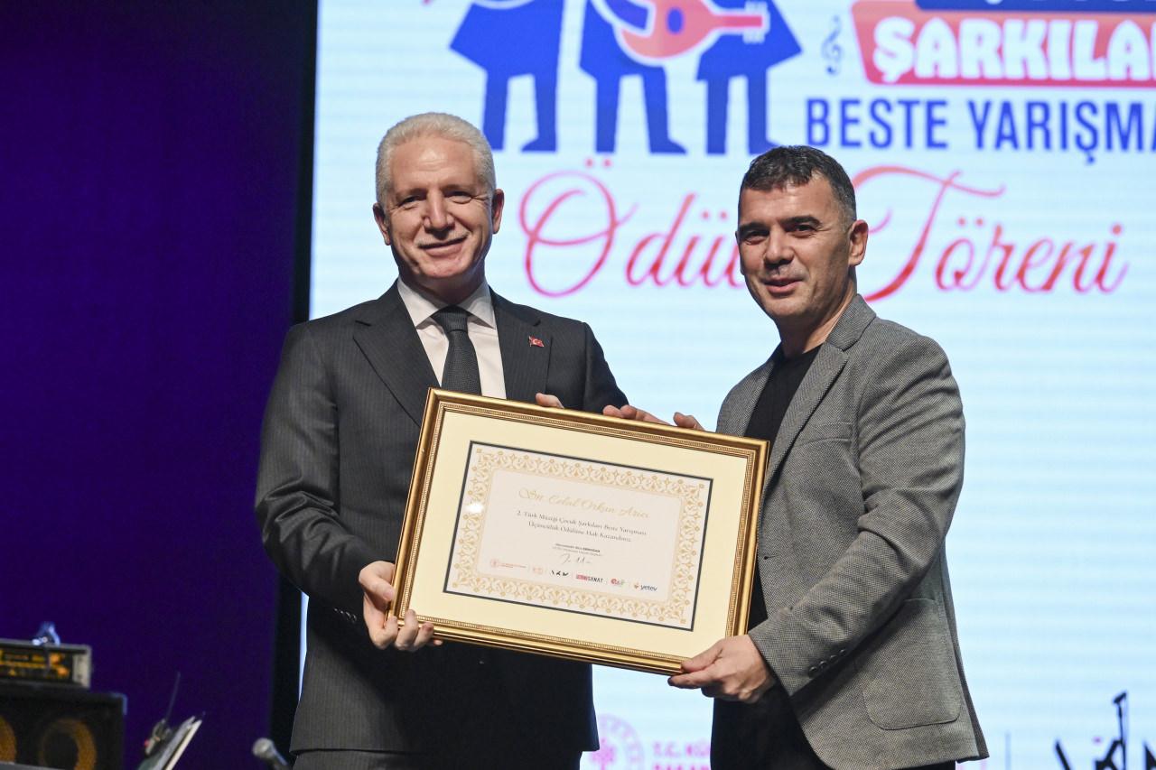 Ödül töreninde konuşan Kültür ve Turizm Bakanı Mehmet Nuri Ersoy, çocukların yalnızca yarını değil, umutla kurulan bir geleceği de hatırlattığını dile getirerek, "Paylaşmanın değerini, karşılıksız sevmenin en temiz halini çoğu zaman onlardan öğreniriz. Masum düşleriyle dünyayı güzelleştiren çocuklarımız, ilhamın en güçlü kaynağıdır. İşte biz de bu ilhamla, çocuklarımızı sanatla buluşturmak, onların yeteneklerini desteklemek, Türk müziğinin köklü mirasını çocuk sesleriyle yarınlara taşımak için Türk Müziği Çocuk Şarkıları Beste Yarışması'nı hayata geçirdik." ifadelerini kullandı.