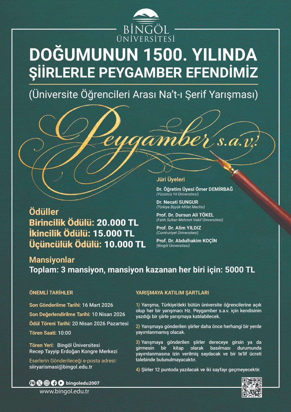 Bingöl Üniversitesi, “Doğumunun 1500. Yılında Şiirlerle Peygamber Efendimiz” temasıyla üniversite öğrencileri arasında ödüllü bir şiir yarışması başlattı. Yarışma, Türkiye'de öğrenim gören tüm üniversite öğrencilerinin katılımına açık olacak.