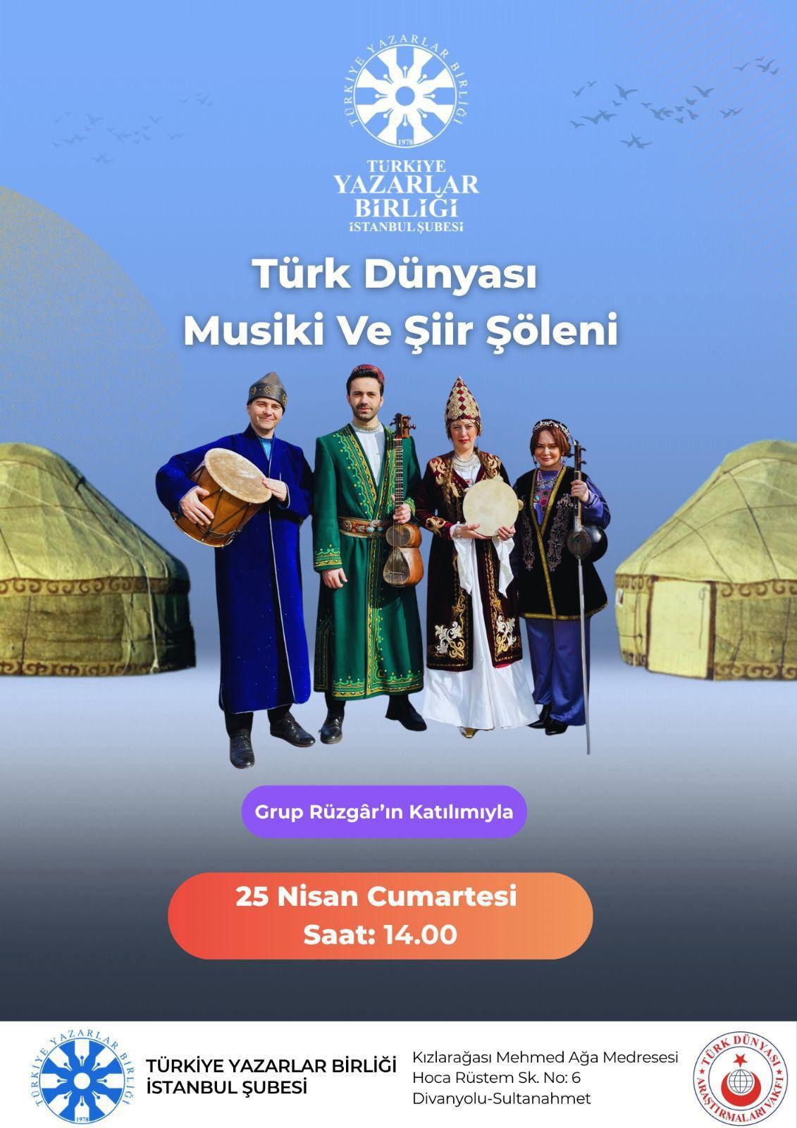 Türkiye Yazarlar Birliği (TYB) İstanbul Şubesi'nin en sahipliğinde Türk dünyasının zengin kültürel mirasını sanatseverlerle buluşturacak “Türk Dünyası Musikî ve Şiir Şöleni”, 25 Nisan Cumartesi günü saat 14.00’te gerçekleştirilecek.