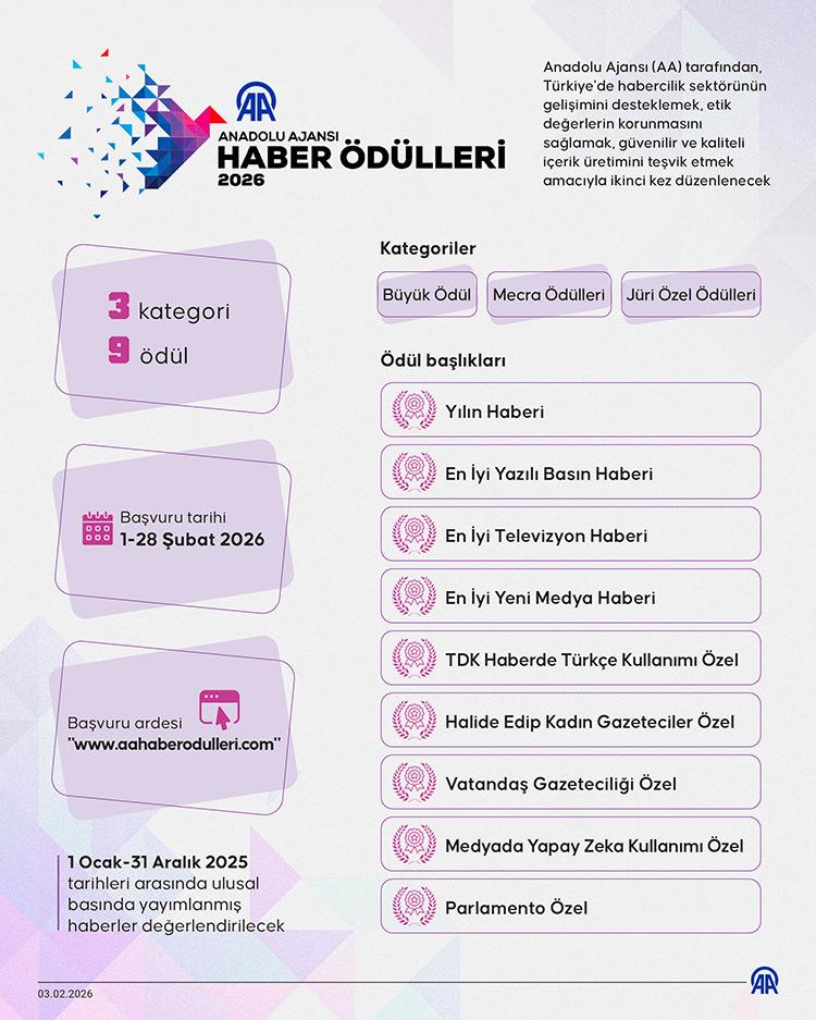 AA'nın 3 kategoride 9 ödül vereceği yarışmanın başvuruları, 28 Şubat 2026 tarihine kadar "www.aahaberodulleri.com" internet sitesinden alınacak.