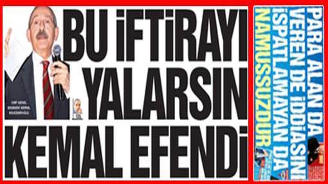 Yeni şafak, tepkisini bugün de sürdürdü ve Kemal Kılıçdaroğlu için"Bu iftirayı yalarsın Kemal Efendi" manşetini attı.