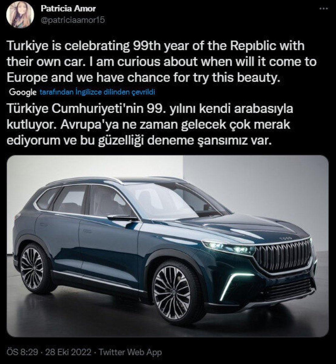 Love Turkiye etiketi altında yorumlar yapan ABD ve Brezilyalı kullanıcılar Togg'un fotoğraflarını da kullanmayı ihmal etmedi.