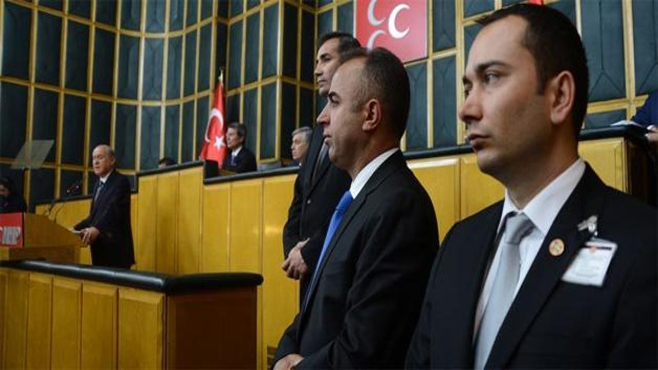 MHP Genel Başkanı Devlet Bahçeli parti grubunda konuşurken iki yanında 10 korumalık 'yumruk timi' hazır ve nazır bekledi.
