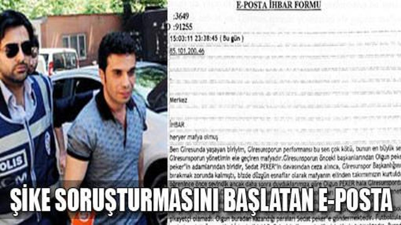 "Ben Giresun'da yaşayan biriyim" diye başlayan e-posta, şike operasyonunun Olgun Peker'le ilgili kısmını başlattı. Olgun Peker'in Giresunspor'daki ilişkileri üzerine yoğunlaşan soruşturma, giderek Sivasspor, Eskişehirspor ve Süper Lig'in şampiyonu Fenerbahçe'yi de kapsayan büyük bir şike soruşturmasına dönüştü. Olgun Peker soruşturmasında elde edilen bulgular 2010 yılında polise ulaşan bir başka ihbarla birleşince "futbolun Ergenekon"u çözülmeye başladı.