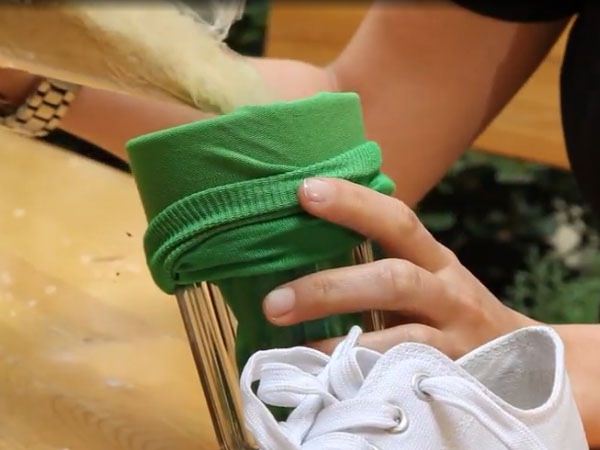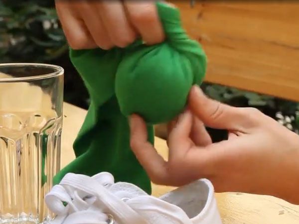 Spor ayakkabılarınız için uygulayacağınız bu yöntem kötü kokuyu yok edecektir. Herhangi bir çorabı su bardağın üzerine geçirin. İçine yarım su bardağı kadar pirinç dökün.