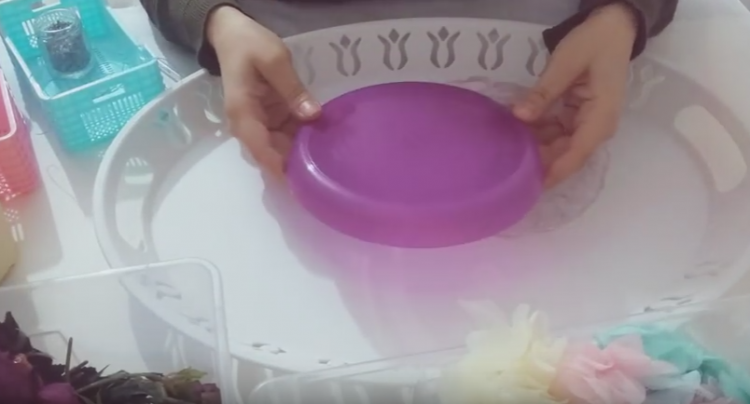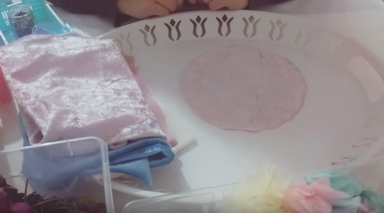 - Öncelikle kese için; kadife kumaşı yuvarlak bir tabak yardımıyla kalemle çizelim.