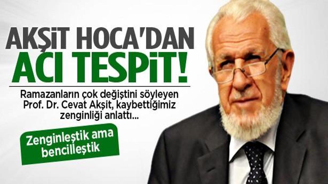 Günümüz Ramazanlarının çok değiştini söyleyen Prof. Dr. Cevat Akşit, 'Eskiden zenginler fakirler için sofra kurardı. Misafirsiz sofra olmazdı. Zenginlik bizi bencilleştirdi' diyor.