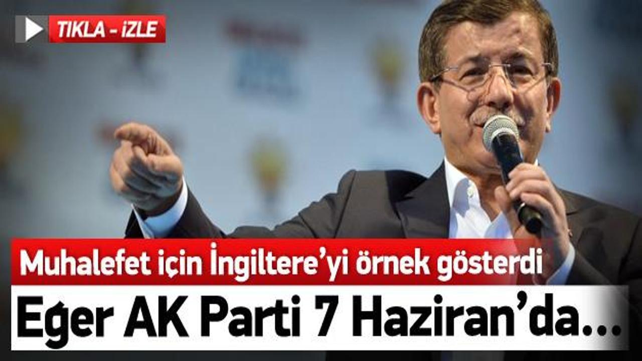 Hatay mitinginde meydan okuyan Davutoğlu, "İngiltere'de seçimi kaybeden üç muhalefet lideri de istifa etti. Ben buradan, Hatay'dan meydan okuyorum. Eğer AK Parti 7 Haziran'da en güçlü parti olarak çıkmazsa, tek başına iktidar olmazsa, ben açıklıyorum 8 Haziran'da istifa edeceğim. Bahçeli 12 seçim kaybetti, Kılıçdaroğlu da kaybetti. 8 Haziran'da istifa edip bırakıp gidebilirler mi?" diye konuştu.
