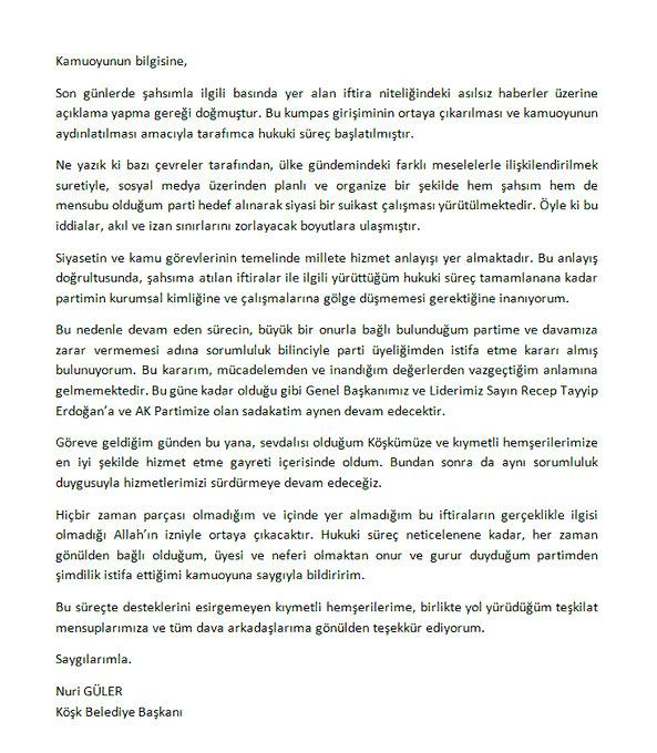Belediyede işe aldığı bir kadın ile ilişki yaşadığı iddia edilen Aydın Köşk Belediye Başkanı Nuri Güler, AK Parti Merkez Disiplin Kurulu’na sevk edilmesinin ardından istifa ettiğini duyurdu.