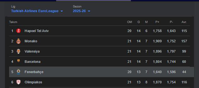 20 maçta 13 galibiyet, 7 yenilgi yaşayan sarı-lacivertliler Basketbol Avrupa Ligi'nde 5. sırada yer alıyor.
