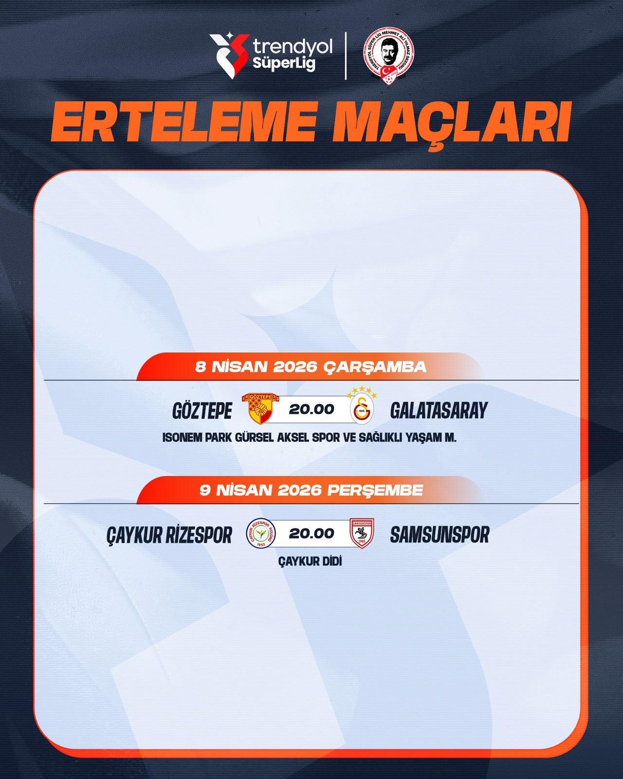 Trendyol Süper Lig'in 27. haftasında iki mücadele ertelenmişti. Lider Galatasaray'ın deplasmanda oynayacağı Göztepe mücadelesi UEFA Şampiyonlar Ligi son 16 turu rövanş maçı nedeniyle, Samsunspor'un da yine deplasmanda oynayacağı Çaykur Rizespor maçı UEFA Konferans Ligi son 16 turu rövanş mücadelesi sebebiyle ileri bir tarihe ertelenmişti.